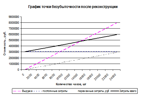 Из таблицы видно, что в связи с реконструкцией автосервиса выручка от реализации услуг возросла на 4 539 273 рубля 85 копеек или на 57,36%. Так же увеличилось число производственных рабочих на 5 человек в связи с добавлением новой услуги по антикоррозионной обработке кузова и введением 2-х сменной мойки. Из-за увеличения числа производственных рабочих увеличился фонд оплаты труда на 989032 рубля 31 копейку или на 48,07%. Так же видно что до реконструкции автосервиса на 1 рубль выручки приходилось 26 копеек заработной платы, а после реконструкции этот показатель снизился на 2 копейки и составляет 24 копеек. Себестоимость услуг возросла на 2 834 626 рублей 34 копейки или на 59,2%, себестоимость продукции выросла больше чем выручка от реализации, это снижение обосновывается тем, что в себестоимость продукции были включена часть процентов по кредиту в размере 525 000 рублей. Это отношение видно из расчета показателя 6, так до реконструкции автосервиса на 1 рубль выручки приходилось 60 копеек затрат, а после реконструкции уже 61 копейка. Чистая прибыль предприятия после реконструкции составит 4 633 859 рублей 16 копеек, что выше суммы чистой прибыли до реконструкции на 1663785 рублей 71 копейку, Такой рост прибыли обосновывается увеличением количества клиентов, за счет грамотно подобранного спектра услуг предлагаемых данным автосервисом и их новшеством. После реконструкции автосервиса выработка одного рабочего составила 691809 рублей 80 копеек, что выше показателя до реконструкции на 83 094 рубля 22 копейки. Этот рост оправдывается тем, что внедряется новый вид услуг по антикоррозионной обработке и как новшество на ранке услуг в Калининградской области он будет пользоваться большим спросом, так же для его стимулирования будет осуществляться маркетинговая политика. Уровень рентабельности остался не низменным. Показатель фондоотдачи снизился на 68 копеек, показатель фондоемкости вырос на 19 копеек и фондовооруженности, так же возросла на 165 492 рубля 24 копейки. Эти изменения обосновываются тем, что предприятие внедрило большое количество нового оборудования, со временем эти показатели изменят свою динамику в лучшую сторону, так как стоимость оборудования будет уменьшаться за счет износа, амортизации. Для реализации проекта необходимо 4 313 991 рубль 25 копеек, срок окупаемости проекта составляет 0,93 года. РР = 4 313 991,25/4 633 859,16 = 0,93 года Предприятие окупит расходы по реализации данного проекта менее чем за 1 год. Это связано с увеличением потока клиентов на 294 автомобиля в год. Проект является эффективным, окупаемость происходит менее чем за год. 4.1 Расчет точки безубыточностиДля оценки и анализа проекта, заключающегося в сопоставлении доходов и расходов, связанных с реализацией данного проекта, рассчитаем критический объем реализации при котором достигаются условия безубыточности. Критический объем реализации рассчитывается по следующей формуле: Q= FC / (p - a), (41) Где Q - критический объем реализации; FC - постоянные затраты; р - цена за единицу; а - переменные затраты на единицу продукции. До реконструкции Q = 1655486,88/ (324,57 - 128,29) = 8434 ч. После реконструкции Q = 3044952,76/ (330,15 - 121,15) = 14 569 ч. Представим графически