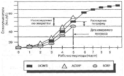 Отставание от графика определяется разностью между плановой стоимостью работ по графику (BCWS) и плановой стоимостью выполненных работ (BCWP). Рис. 14.4.2 дает графическое представление анализа на основе факта.