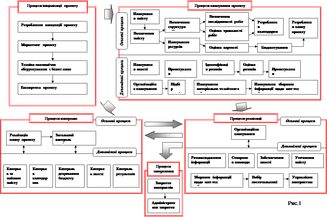 Розглянемо зміст етапів розроблення і впровадження системи управління якістю відповідно до вимог [1] на основі методології УП. При цьому сама задача впровадження системи буде виглядати як окремий проект, що складається з низки основних і допоміжних процесів, представлених на рис. 1.
