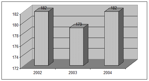 Рис. 1.3. Кількість банків за реєстром З діаграми 1.3. видно, що у 2002 та 2004 роках кількість банків в Україні є однаковою (182), в 2003 році у порівнянні з 2002 і 2004 роками кількість банків менша (179). В цілому можна зробити висновок, що кількість банків в Україні залишається відносно сталою, що може свідчити і про достатню насиченість банківськими послугами, і про недостатній розвиток банківської справи та законодавства в цій сфері Розподіл банків за організаційно-правовою формою наведено в таблиці 1.1 Таблиця 1.1 Аналіз банків за організаційно-правовою формою
