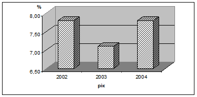 З таблиці 1.8 можна зробити висновок, що частка міжбанківських кредитів у загальній структурі зобов’язань по всіх досліджуваних роках є оптимальною (13,9, 16,1 та 16,6% відповідно у 2002, 2003 та 2004 роках). У 2004 році сума міжбанківських кредитів порівняно з 2002 роком зросла майже у 2 рази. Це свідчить про інтенсивний розвиток взаємовідносин між банками. Процес емісії цінних паперів власного боргу дещо призупинився на кінець 2004року і становить 149,7млн.грн. Середньорічні процентні ставки за депозитами у банківській системі України за останні три роки практично не змінились і становлять 7,4% за 2002рік, 6,8% за 2003 рік, 7,4% за 2004 рік. Динаміка змін середньорічних процентних ставок за депозитами у національній валюті наведена на рисунку 1.11.
