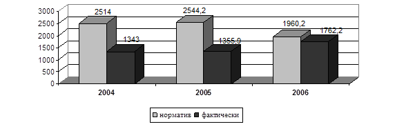 Рис.10. Объёмы оказания амбулаторно-поликлинической помощи в 2004-2006 гг. по сравнению с нормативами Программы государственных гарантий (тысяч посещений)