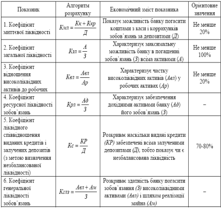 Різні коефіцієнти переважно розраховуються як співвідношення між обсягами активів і відповідних зобов'язань. Розрахунок коефіцієнтів ліквідності у вигляді економічних нормативів входить до складу обов'язкової звітності банків і використовується регуляторами для контролю за рівнем ліквідності кредитних організацій. Виділяють три основні групи коефіцієнтів: 1. Коефіцієнти для розрахунку обсягу і структури зобов’язань банку. 2. Коефіцієнти для визначення обсягу і структури ліквідних коштів, що знаходяться на балансі банку. 3. Коефіцієнти, що дають можливість визначити здатність виконання банком своїх зобов’язань за рахунок ліквідних активів. Як правило, визначається один (або декілька) основних коефіцієнтів для оцінки ліквідності. Інші слугують додатковими (допоміжними), які допомагають детальніше дослідити той чи інший аспект оцінки ліквідності (табл. 2). Таблиця 2. Показники ліквідності балансу банку