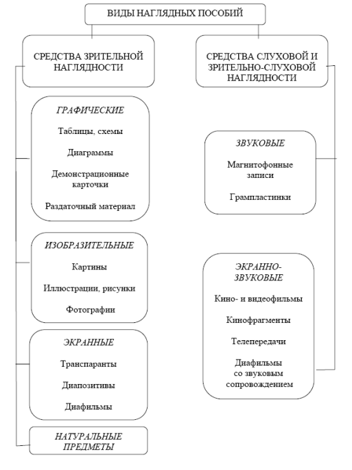 Рис.1.1 Виды наглядных пособий 2. Демонстрационные изобразительные пособия. К этому виду наглядных пособий относятся, прежде всего, картины и учебные таблицы с изображением ряда знакомых детям предметов, наборы картинок, картины со вставками, аппликации. Используются как наглядный материал, что значительно расширяет возможности учителя при обучении детей грамматики, пунктуации, фонетики и пр., или для иллюстрирования упражнений. К демонстрационным изобразительным пособиям относятся также модели измерительных приборов и инструментов (часовой циферблат, весы), муляжи и макеты. Муляжи и макеты могут использоваться как иллюстративный материал при составлении упражнений. Наконец, к демонстрационным изобразительным пособиям относятся изображения и модели различных предметов или ситуаций. 3. Таблицы. Таблицами называют текстовые или числовые записи, располагаемые в определенном порядке. Чаще всего в виде колонок, а также сгруппированные вместе серии рисунков и схем с текстом или без него. Таблицы издаются на больших листах бумаги, наклеенных для удобства пользования на ткань или картон. По своему значению таблицы могут быть разделены на группы: познавательные; инструктивные; тренировочные; справочные[3] ; К познавательным таблицам относятся такие, которые содержат в себе новые сведения и поэтому чаще всего используются при объяснении нового материала. К их помощи можно прибегать также при повторении с целью расширения и обобщения знаний учащихся. Примером познавательных таблиц может служить таблица синонимов. К познавательным таблицам относится также таблицы "Положение предметов", "Времена года", "Цвета", которые дают наглядное представление об определенных понятиях и явлениях. Инструктивные таблицы в наглядной форме дают указания по выполнению тех или иных действий, связанных с формированием навыков написания букв, слов, словосочетаний и предложений, выполнения упражнений и заданий, навыков говорения. К этим таблицам относятся таблицы с образцами рукописных букв, с примерами, указывающими порядок выполнения действий при разборе слова, с примерами алгоритмов действий при выполнении упражнений и др. такие таблицы вывешиваются в классе на более или менее продолжительное время, чтобы они помогали учащимся в их работе, давали необходимые указания. Тренировочные таблицы предназначаются для проведения многократных упражнений, с целью формирования навыков. Наиболее известными из таких таблиц являются таблицы для иллюстрации упражнений. Эти таблицы освобождают учителя от необходимости выписывать большое количество слов и тем самым облегчают его работу и позволяют экономить время. Справочные таблицы содержат материал, который часто бывает нужен учащимся как при выполнении упражнений, так при выполнении практических работ. Они, как и инструктивные таблицы, вывешиваются в классе на продолжительное время[4] . 4. Иллюстрации. Под иллюстрациями обычно понимают помещенные в учебнике рисунке и схематические изображения различных предметов и групп предметов. А также планы, чертежи, схемы, таблицы, как и рассмотренные выше наглядные демонстрационные пособия, иллюстрации используются в самых различных случаях. С их помощью наглядно показываются предметы, о которых идет речь, выполняемые действия или разъясняется содержан