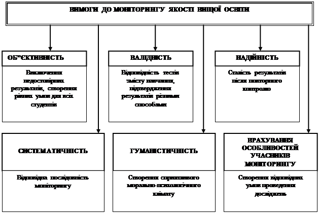 | Моніторинг систем управління якістю ВНЗ 1. Моніторинг якості вищої освіти. Традиційний підхід Традиційно моніторинг якості вищої освіти пов’язується зі спостереженням та оцінюванням результатів освіти з подальшим їх аналізом і вжиттям заходів для підвищення рівня підготовки випускників ВНЗ. У розвиток цього підходу пропонувалось у [1] розглядати моніторинг як систему, яка включає взаємодію суб’єктів (зовнішніх і внутрішніх) та об’єктів (студенти, викладачі, навчальний процес). Виходячи з світових тенденцій розвитку вищої школи, варто відзначити перспективність рейтингової системи поточного контролю успішності студента, яка сприяє суттєвому підвищенню рівня якості підготовки за рахунок стимулювання студента до планомірної, систематичної навчальної діяльності протягом усього семестру. Передумовою для створення ефективної системи контролю є організація інтерактивного процесу навчання, коли викладач і студенти є партнерами на шляху до здобуття нових знань, а також належна організація самопідготовки студента. Останнім часом поширеною стала практика поєднання результатів поточного і проміжного контролю у інтегровану оцінку успішності студенту за семестр. Ця оцінка пропорційно враховує рівень відвідування занять, результати поточного контролю (тестів, контрольних робіт, поточних завдань, наукової роботи) і поточного контролю (заліків, іспитів, курсових робіт, практики). Інтегрована оцінка успішності студента за семестр дорівнює: Oic = P1 В3 + P2 PПК + P3 PПРК , де де P1 , P2 , P3 - вагові коефіцієнти оцінки відвідування занять В3 , результатів поточного контролю PПК та проміжного контролю PПРК. Аналогічно за рейтинговою системою має оцінюватись діяльність викладацького складу та іншого персоналу ВНЗ: Oi П = P1 РОС + P2 PМР + P3 PНД , де де P1 , P2 , P3 - вагові коефіцієнти результатів опитування студентів щодо якості викладання РОС , експертної оцінки результатів методичної діяльності викладача PМР , експертної оцінки результатів наукової діяльності PНД. У [2] деталізовано вимоги до традиційної системи моніторингу, його змісту, функцій та методів. При цьому наголос робиться на необхідності відслідковування не тільки рівня професійної підготовки спеціаліста, а також його особистісних якостей. На рис.2 наведено основні вимоги до моніторингу якості вищої освіти.