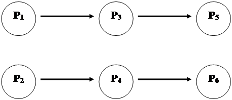 Елементи P1 і P2 не залежать від інших, а для того, щоб отримати значення елементів P3 , P4 , P5 , P6 необхідно мати значення P1, P2, P3, P4 відповідно. Інформаційний граф G (P, Ro ) у цьому досить простому випадку буде мати вигляд, представлений на рис. 6. Для формалізації виділення вхідних, проміжних і вихідних показників процесів потрібно на основі графу G(P,Ro ) побудувати матрицю досяжності В. Матриця В є квадратною бінарною матрицею, яка проіндексована за обома вісями множиною показників Р, аналогічно матриці сумісності А.