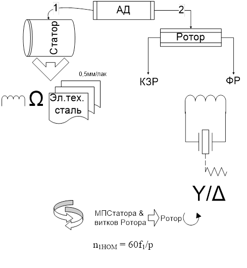 | Федеральное агентство по образованию Российский государственный профессионально-педагогический университет Инженерно-педагогический институт Кафедра профессионально–педагогических технологий Контрольная работа по дисциплине: Методика профессионального обучения на тему: Назначение и конструктивные особенности асинхронных машин переменного тока Екатеринбург 2010 Тема разрабатываемого урока : Назначение и конструктивные особенности асинхронных машин переменного тока Тип урока : урок изучения новых знаний. Образовательная цель урока : Изучение и первичное закрепление знаний. Актуализация ведущих знаний. Оснащение урока : плакаты: «Асинхронный двигатель с короткозамкнутым ротором», «Асинхронный двигатель с фазным ротором», «Магнитопровод асинхронных машин». План урока 1. Организационная часть (приветствие, проверка присутствующих учащихся, запись даты и темы в тетрадь) 5 мин. 2. Объяснение нового материала 120 мин. 3. Вывод 15 мин. 4. Домашнее задание 20 мин. 2. Конспект учебного материала по выбранной теме 1. Назначение и области применения асинхронных машин Асинхронной машиной называется двухобмоточная электрическая машина переменного тока, у которой только одна обмотка (первичная) получает питание от электрической сети с постоянной частотой ω1 , а вторая обмотка (вторичная) замыкается накоротко или на электрические сопротивления. Токи во вторичной обмотке появляются в результате электромагнитной индукции. Их частота ω2 является функцией угловой скорости ротора Ω, которая, в свою очередь, зависит от вращающего момента, приложенного к валу. Наибольшее распространение получили асинхронные машины с трехфазной симметричной разноименнополюсной обмоткой на статоре, питаемой от сети переменного тока, и с трехфазной или многофазной симметричной разноименнополюсной обмоткой на роторе. Машины такого исполнения называют просто «асинхронными машинами», в то время как асинхронные машины иных исполнений относятся к «специальным асинхронным машинам». Асинхронные машины используются в основном как двигатели; в качестве генераторов они применяются крайне редко. Асинхронный двигатель является наиболее распространенным типом двигателя переменного тока. Разноименнополюсная обмотка ротора асинхронного двигателя может быть короткозамкнутой (беличья клетка) или фазной (присоединяется к контактным кольцам). Наибольшее распространение имеют дешевые в производстве и надежные в эксплуатации двигатели с короткозамкнутой обмоткой на роторе, или короткозамкнутые двигатели (рис. 1). Эти двигатели обладают жесткой механической характеристикой (при изменении нагрузки от холостого хода до номинальной их частота вращения уменьшается всего на 2÷5%). Двигатели с короткозамкнутой обмоткой на роторе обладают также довольно высоким начальным пусковым вращающим моментом. Их основные недостатки: трудность осуществления плавного регулирования частоты вращения в широких пределах; потребление больших токов из сети при пуске (в 5÷7 раз превышающих номинальный ток). Двигатели с фазной обмоткой на роторе или двигатели с контактными кольцами (см. рис. 6) избавлены от этих недостатков ценой усложнения конструкции ротора, что приводит к их заметному удорожанию по сравнению с короткозамкнутыми двигателями (примерно в 1,5 раза). Поэтому двигател