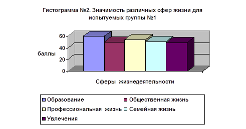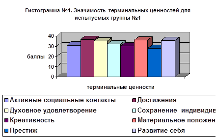 Таблица №1. Уровень значимости терминальных ценностей в разных сферах жизни для испытуемых группы №1