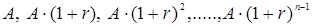 Так, если в предыдущей задаче предположить, что исходный поток представляет собой поток пренумерандо, его приведенная стоимость будет равна: Pvpre = PVpst*(1+r)=44,97*1,12=50,37 тыс. руб. ОЦЕНКА АННУИТЕТОВ Одним из ключевых понятий в финансовых и коммерческой расчетах является понятие аннуитета. Логика, заложенная в схему аннуитетных платежей, широко используется при оценке долговых и долевых ценных бумаг, в анализе инвестиционных проектов, а также в анализе аренды. ОЦЕНКА СРОЧНЫХ АННУИТЕТОВ Аннуитет представляет собой частный случай денежного потока, а именно, это поток, в котором денежные поступления в каждом периоде одинаковы по величине. Если число равных временных интервалов ограничено, аннуитет называется срочным. В этом случаи: С1 = С2 = …… = Сn = A Примером срочного аннуитета постнумерандо могут служить регулярно поступающие рентные платежи за пользование сданным в аренду земельным участком в случае, если договором предусматривается регулярная оплата аренды по истечении очередного периода. В качестве срочного аннуитета пренумерандо выступает, например, схема периодических денежных вкладов на банковский счет в начале каждого месяца с целью накопления достаточной суммы для крупной покупки. Для оценки будущей и приведенной стоимости аннуитета можно пользоваться рассмотренными вычислительными формулами, вместе с тем благодаря специфике аннуитетов в отношении равенства денежных поступлений эти формулы могут быть существенно упрощены. Прямая задача оценки срочного аннуитета при заданных величинах регулярного поступления (А) и процентной ставке (r) предполагает оценку будущей стоимости аннуитета. Как следует из логики, присущей схеме аннуитета, наращенный денежный поток имеет вид: