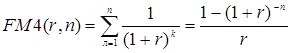 Экономический смысл мультиплицирующего множителя FМ заключается в следующем: он показывает, чему будет равна суммарная величина срочного аннуитета в одну денежную единицу (например, один рубль) к концу срока его действия. Предполагается, что производится лишь начисление денежных сумм, а их изъятие может быть сделано по окончании срока действия аннуитета. Множитель FM часто используется в финансовых вычислениях, и поскольку легко заметить, что значения в общем виде зависят лишь от r и n, их можно табулировать. Пример Вам предлагают сдать в аренду участок на три года и выбрать один из двух вариантов оплаты аренды: а) 10 млн.руб. в конце каждого года; б) 35 млн.руб. в конце трехлетнего периода. Какой вариант более предпочтителен, если банк предлагает 20% годовых по вкладам? Первый вариант оплаты как раз и представляет собой аннуитет постнумерандо при n = 3 и А = 10 млн. руб. В этом случаи имеется возможность ежегодного получения арендного платежа и инвестирования полученных сумм как минимум на условною 20% годовых (например, вложение в банк). К концу трехлетнего периода накопленная сумма может быть рассчитана: FV = А*FМЗ(20%, 3) = 10*3,640 = 36,4 млн. руб. Таким образом, расчет показывает, что вариант (а) более выгоден. Общая постановка обратной задачи оценки срочного аннуитета постнумерандо также достаточно наглядна. В этом случае производится оценка будущих денежных поступлений с позиции текущего момента, под которым в данном случае понимается момент времени, с которого начинают отсчитываться равные временные интервалы, входящие в аннуитет. Экономический смысл расчетов по предыдущей задаче состоит в следующем: с позиции текущего момента реальная стоимость данного аннуитета может быть оценена в 21,064 млн. руб. Общая формула для оценки текущей стоимости срочного аннуитета постнумерандо выводится из базовой формулы и имеет вид: