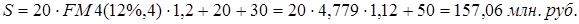 В отношении альтернативного варианта, предусматривающего возмещение вложенной суммы частями, предполагается, что ежегодные поступления в размере 20 млн. руб. можно немедленно пускать в оборот, получая дополнительные доходы. Если нет других альтернатив по эффективному использованию этих сумм, их можно депонировать в банк. Денежный поток в этом случае можно представить двояко: а) как срочный аннуитет постнумерандо с А = 20, n = 5, r = 20% и единовременное получение суммы в 30 млн. руб.; б) как срочный аннуитет пренумерандо с А = 20, n = 4, r = 20% и единовременное получение сумм в 20 и 30 млн. руб. В первом случае имеем:
