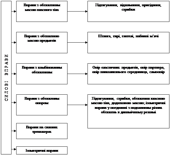 Як свідчать отримані результати, із загальної кількості учнів експериментальних класів, допущених до складання нормативів, 80% хлопчиків і 89% дівчаток виконали державні тести на “5” і “4” бали. Із учнів контрольних груп на “5” і “4” виконали тільки 55% хлопчиків і 54,7% дівчаток. Тільки 1,5% хлопчиків із експериментальних класів виконали державні нормативи на “2” бали, у той же час на “2” і “1” бал із учнів контрольних груп виконало 17,5%. Результати проведеного тестування підтвердили високу ефективність експериментальної методики. Висновки до 3-го розділу1. Виявлено закономірність фізичного розвитку у дітей молодшого шкільного віку у зміні розмірів і маси тіла, окружність грудної клітки в принципі співпадає з характером вікового розвитку і характеризує динаміку найкращого приросту у хлопчиків 9 - 10 років і дівчаток 8 - 9 років, що є основою управління процесами формування фізичного здоров’я. 2. Практично всі показники фізичних якостей у цьому віці демонструють високі темпи приросту, які певною мірою відображають формування структурних і функціональних властивостей організму в онтогенезі. 3. Найбільш суттєвий приріст у початковій школі відзначається за швидкісно-силовими показниками, що узгоджується з дослідженнями інших авторів. 4. Темпи та величини приростів у розвитку показників сили і витривалості, а також функціональної діяльності серцево-судинної і дихальної систем у хлопчиків кращі, ніж у дівчаток. Розділ IV. Методика розвитку та вдосконалення фізичних якостей4.1 Методика розвитку і вдосконалення силиПерш ніж здійснювати силову підготовку учнів, потрібно виміряти рівень розвитку сили. Коли визначено вихідний рівень, тоді можна правильно поставити завдання, підібрати відповідні засоби та методи. Загалом ми рекомендуємо для розвитку сили застосовувати вправи, що подані на рис.4.1