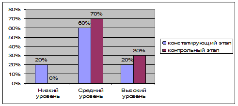 Рис.4 Сравнительный анализ уровня конфликтности в экспериментальной группе на констатирующем и контрольном этапе Сравнение данных констатирующего этапа с данными, полученными на контрольном этапе показывает, что количество детей с высоким уровнем конфликтности уменьшилось до 0, на 10% увеличилось количество детей, имевших средний уровень конфликтности. За счет уменьшения количества высокого уровня конфликтности на 10% увеличилось количество детей, показавших низкий уровень конфликтности. В целом, это доказывает, что содержание и приемы формирующего этапа эксперимента были выбраны правильно и оказались эффективными для снижения уровня конфликтности у детей. Незначительные изменения уровня конфликтности контрольной группы, выявленные на контрольном этапе: уменьшение на 10% детей с высоким и увеличение на 10% с низким уровнем конфликтности, средний уровень конфликтности без изменений подтверждает предположения, что без специально организованных занятий достижение существенного изменения конфликтности у детей весьма затруднительно. Сравнительный анализ уровня конфликтности экспериментальной и контрольной групп на контрольном этапе эксперимента представлен в таблице 5. Таблица 5 Показатели уровня конфликтности экспериментальной и контрольной групп на контрольном этапе эксперимента