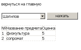 Рис. 8. Успеваемость студента Соответственно чтобы посмотреть информацию по каждому из студентов, его необходимо выбрать из списка, и нажать на кнопку. Появится таблица, в которой наглядно видно название предмета и оценку по этому предмету. Бывают такие ситуации, что название предмета или инициалы студента были введены неверно, для данных целей предусмотрены страницы «изменить ФИО студента» и «изменить название предмета». Страница для изменения «ФИО студента» выглядит следующим образом: