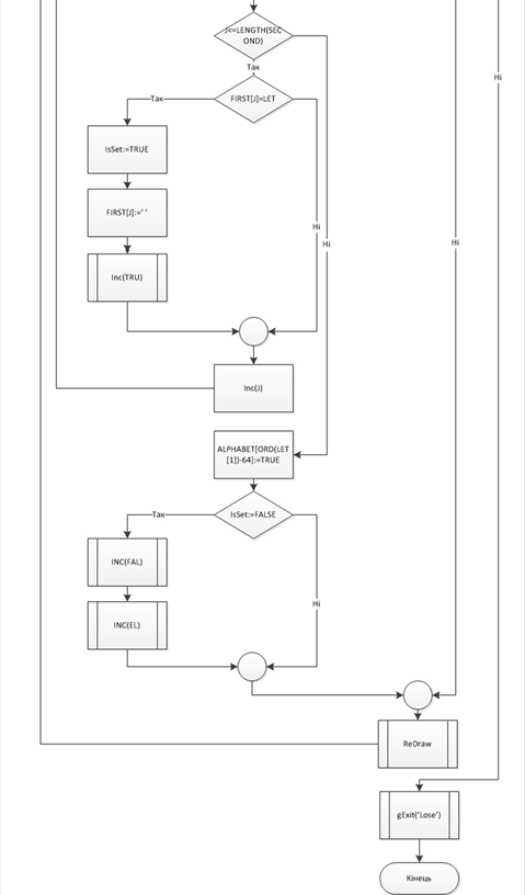 | Міністерство освіти і науки України Полтавський національний технічний університет імені Юрія Кондратюка Факультет інформаційних та телекомунікаційних технологій і систем Кафедра комп’ютерних та інформаційних технологій і систем Курсова робота з дисципліни "Основи програмування та алгоритмічні мови" Розробив cтудент групи 101-ТН Керівник роботи Полтава 2010 Зміст Вступ Постановка задачі Розв’язання задачі Алгоритм задачі Реалізація програми Висновок Використана література ВступДля виконання курсової роботи потрібно мати деякий початковий багаж знань по програмуванню. Володіти однією з мов програмування в моєму випадку це Turbo Pascal. Turbo Pascal - алгоритмічна мова програмування універсального призначення. Існують діалекти мови з підтримкою об'єктно-орієнтованого програмування. Роком створення Pascal вважається 1970-й, і творцем цієї мови програмування є Ніклаус Вірт. Початкова мета розробки мови диктувалася потребою інструмента "для навчання програмуванню як систематичній дисципліні". Pascal належить до Algol-подібних мов програмування, оскільки використовує семантику Algol-ла. Однак Pascal мав суттєве удосконалення - жорстку типізацію. Це означало, що присвоювання можна було виконувати лише для змінних, що належать до одного типу (одночасно вказувались правила, за якими типи вважались однаковими). Це удосконалення суттєво покращило стиль програмування, оскільки значну частину помилок вдавалось виявити ще на етапі компіляції - що збільшує надійність програм. Виконуючи цю роботу я використав практичні знання, отримані при виконанні лабораторних робіт. "Гра Виселица" - існує загадане слово, його потрібно відгадати називаючи по одній літері. Якщо названа літера відсутня у слові, то вимальовується наступний елемент вішалки. Гра відбувається на екрані. Гравець бачить вішалку, що складається з семи частин та знаходиться зліва вгорі. Зправа вгорі знаходиться коротка інструкція до гри. Внизу показані названі літери. Постановка задачіРозробити программу для вирішення поставленої прикладної задачі. При вирішенні задачі необхідно: Створити программу у середовищі програмування Turbo Pascal Розробити алгоритм функціонування программи Надати блок-схему алгоритму Продемонструвати роботу программи УМОВА ЗАДАЧІ (рус) В игре "Виселица" один игрок загадывает слово, а другой пытается его угадать, называя по одной буквы. Если буквы нет в этом слове, то рисуется один из элементов картинки (вся картинка состоит из 7 элементов: эшафот, виселица, веревка, голова, руки, туловище и ноги). Если игрок угадывает букву, то буква (или буквы, если имеется несколько одинаковых букв) пишется на соответствующем месте. Если вся картинка будет нарисована, а слово не угадано, то игрок проигрывает. Если все буквы слова будут открыты, а картинка еще не дорисована, то игрок выигрывает. В первой строке входного файла - загаданное слово. Вывести одну из трех строк: Win - выиграш Lose - проиграш Unknown - при исчерпании набора букв и невыполнении условий выиграша или проиграша. Розв’язання задачіУ программы використані додаткові модулі Graph та Crt. З модуля Crt використані функції: ClrScr - для очистки графічного інтерфейсу. Delay - для затримки виконання програм, але при використанні цієї команди на процесорах більше 200 MHz виникають проблеми, так як цикл затримки закінчується швидше і може виникну