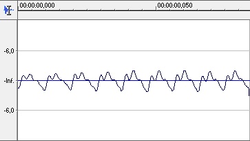 Рисунок 3.4 - Згенерований проміжок між фонемами "Р_" і "А" із застосуванням усереднює фільтра. 3.4 Обробка вихідного звуку Перед відтворенням звук ще два рази зазнає обробці. При першій його гучність коригується залежно від установок користувача. Для чого значення сигналу множиться на коефіцієнт гучності, який варіюється від нуля і до 1.5. На малюнках 3.5 - 3.8 зображена фонема "Р" при різних рівнях гучності.