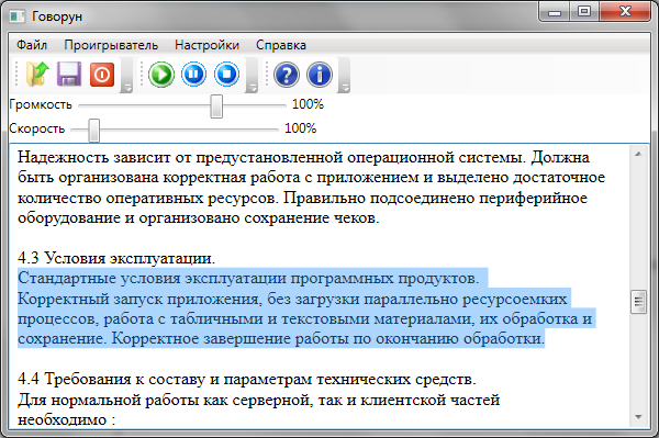 Рисунок 4.1 – Головне вікно програми 4.2 Відтворення мови Для відтворення мови, потрібно в текстове поле ввести текст, або відкрити файл, вибравши в меню Файл-> Відкрити. У вікні вказати потрібний файл. На поточний момент підтримуються формати. Txt і. Rtf. Для відтворення звуку необхідно вибрати пункт меню Програвач-> Говорити. Для припинення, необхідно натиснути в тому ж пункті вибрати пункт Пауза, а для зупинки Стоп. Усі ці пункти продубльовані в панелі інструментів. Якщо необхідно відтворити не весь текст, а його частина, то можна виділити частину тексту запустити програвання, як вказано на малюнку 4.2.
