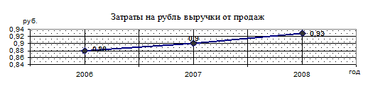 Из данных таблицы 2.10 следует, что затраты на 1 рубль выручки от продаж в ООО «ЖелДорСтрой» за анализируемый период в целом обнаруживают тенденцию к увеличению с 0,88 руб. в 2006 г. до 0,93 руб. в 2008 г. Однако по годам наблюдается неоднозначная тенденция: в 2007 г. по сравнению с 2006 г. они повысились на 0,2 руб. или 2,3%, а в 2008 г. по сравнению с 2007 г. увеличились на 0,03 руб. или 3,3%. Таким образом, в 2008 г. на рубль выручки от продаж приходилось 93 коп. затрат и 7 коп. прибыли. Графически динамика затрат на 1 рубль выручки от продаж ООО «ЖелДорСтрой» за 2006–2008 гг. представлена на рис. 2.4.