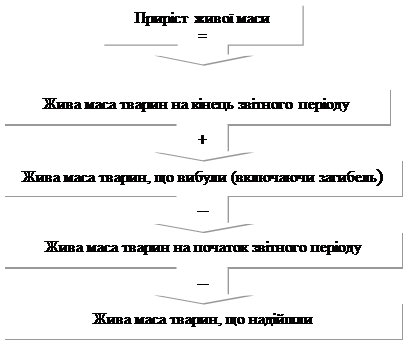 Рис. 2. Визначення приросту живої маси тварин Собівартість 1 ц живої маси визначають за формулою: С=ВП/ЖМ (1) де: С - собівартість 1 ц живої маси ВП - вартість поголів’я ЖМ - жива маса , ц Для визначення вартості поголів’я користуються формулою: ВП = В - ВПП + БВ п + БВ н + ВПр (2) де: ВП - вартість поголів’я, В - витрати на дорощування і відгодівлю за звітний рік , ВПП - вартість побічної продукції, БВ п - балансова вартість тварин на початок року, БВ н - вартість тварин, надійшовши протягом року на дорощування, ВПр - вартість приплоду поточного року ( без вартості загиблих тварин). Жива маса тварин визначається за формулою: ЖМ = ЖМ к + ЖМ в (3) де : ЖМ - жива маса тварин, ЖМ к - жива маса тварин в залишку на кінець року, ЖМ в - жива маса поголів’я, що вибуло, без маси падежу. Витрати в тваринництві, зокрема м’ясному скотарстві, обліковують за статтями, перелік яких наведено в Методичних рекомендаціях з планування, обліку і калькулювання собівартості продукції сільськогосподарських підприємств: > витрати на оплату праці; > паливо та мастильні матеріали; > засоби захисту тварин; > корми; > роботи та послуги; > витрати на ремонт необоротних активів; > інші витрати на утримання основних засобів; > інші витрати; > непродуктивні витрати; > загальновиробничі витрати. У статті "Витрати на оплату праці" відображають основну та додаткову заробітну плату працівників, які безпосередньо зайняті в технологічному процесі виробництва продукції м’ясного скотарства: скотарі, пастухи, свинарі тощо. У статті "Паливо та мастильні матеріали" відображають комплексну ціну палива, в яку входять його вартість на виконання технологічних операцій, вартість мастил тощо. До статті "Засоби захисту тварин" відносять вартість придбаних за рахунок коштів підприємства біопрепаратів і дезинфікуючих засобів Вартість препаратів, придбаних за рахунок асигнувань бюджету, списують на зменшення сум цільового фінансування. У статті "Корми" відображають вартість придбаних кормів та кормів власного виробництва, витрати на їх внутрішньогосподарське переміщення з поля на постійне місце зберігання, кормовий склад чи інший підрозділ. На дану статтю відносять також витрати на приготування кормів у кормоцехах і кормокухнях. Ці суми списують безпосередньо на відповідні види і групи тварин прямо або розподіляють між ними пропорційно масі згодованих кормів, що залежить від технологічних особливостей приготування та роздачі кормів. Витрати на транспортування кормів з місць постійного зберігання до кормоцехів, а також безпосередньо на ферму з місця їх зберігання не включають у вартість кормів, а відносять до інших відповідних статей (витрати на оплату праці, роботи і послуги тощо). У статті "Роботи і послуги" відображають витрати на роботи та послуги власних допоміжних виробництв, які забезпечують виробничі потреби, та вартість послуг виробничого характеру, наданих сторонніми підприємствами. На дану статтю відносять вартість послуг автомобільного транспорту, тракторного парку, живої тяглової сили, електропостачання, водопостачання тощо. У статті "Витрати на ремонт необоротних активів" відображають витрати, пов'язані з ремонтом основних засобів, які використовуються у м’ясному скотарстві. У статті "Інші витрати на утримання необоротних активів" відображають: оплату праці, включаючи відрахуванн