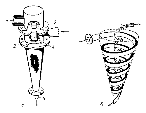 Рис.1 Схема устройства и принцип действия барабанной (шаровой) мельницы В зависимости от формы барабана различают цилиндро-конические и цилиндрические барабанные мельницы. Последние, в свою очередь, бывают трех типов — короткие, длинные и трубные. У коротких барабанных мельниц длина меньше диаметра или близка к нему; у длинных — она достигает 2 - 3 диаметров, а у трубных — длина барабана больше диаметра не менее чем в 3 раза. Трубные мельницы применяются в цементной промышленности. В зависимости от вида дробящей среды различают мельницы шаровые, стержневые, галечные и самоизмельчения. У шаровых барабанных мельниц дробящая среда представлена стальными или чугунными шарами; у стержневых — стальными стержнями, у галечных окатанной кремневой галькой, у мельниц самоизмельчения крупными кусками измельчаемой руды. В зависимости от способа разгрузки измельченного продукта различают мельницы с центральной разгрузкой и разгрузкой через решетку. В шаровой барабанной мельнице стальной барабан, футерованный стальными износостойкими плитами и заполнен обрезками круглого сортового проката или стальными шарами. Мельница «Аэрофол» для сухого самоизмельчения (рис. 2) представляет собой короткий барабан 1 большого диаметра (5,5 - 11 м). На внутренней поверхности вдоль образующей барабана на некотором расстоянии друг от друга укрепляются балки-ребра 2, которые при вращении барабана поднимают куски материала. Падая вниз, куски разбиваются, ударяясь о ребра, одновременно они дробят ударом находящийся внизу материал. На торцовых крышках 3 барабана укреплены кольца 4 треугольного сечения. Назначение этих колец — направлять куски материала в середину барабана. Рис.2 Барабанная мельница «Аэрофол» для сухого самоизмельчения Гидроциклон Аппарат для разделения в водной среде зёрен минералов, отличающихся значением массы. Различают гидроциклоны классификаторы, сепараторы и сгустители. Классификаторы применяются для разделения зёрен по крупности, сгустители — для отделения части воды от зёрен и сепараторы — для обогащения полезных ископаемых в минеральных суспензиях. Гидроциклон представляет собой конус 1 (рис., а) с короткой цилиндрической частью 2, имеющей питающий патрубок 3, по которому подаётся гидросмесь, и сливное отверстие 4. У конической части предусмотрена насадка 5, через которую разгружается нижний продукт разделения. Питающий патрубок расположен таким образом, что пульпа вводится в гидроциклон по касательной и вращается в нём с образованием внешних и внутренних потоков (рис., б). Твёрдые частицы подвергаются воздействию центробежной силы и отбрасываются к периферии. Чем больше масса зерна, тем дальше оно будет отброшено. Зёрна, имеющие большую массу, чем граничные зёрна, по которым производится разделение, остаются во внешнем потоке и, перемещаясь к вершине конуса, разгружаются через насадку. Зёрна с меньшей массой попадают во внутренний поток и выносятся через сливное отверстие. Ввиду простоты конструкции гидроциклоны находят всё большее применение в промышленности. Их совершенствование выражается также в применении сочетания нескольких гидроциклонов, с получением различных продуктов и в автоматическом регулировании процесса разделения зёрен. Впервые гидроциклон применен в 1939 на углеобогатительной фабрике в Голланди