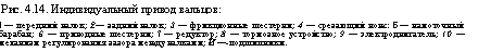Рис. 11. Групповой привод вальцов: 1 – электродвигатель; 2 – редуктор; 3 – большая шестерня; 4 – малая шестерня; 5 – фрикционные шестерни; б – валки. Для предотвращения попадания вальцуемого материала в подшипники на концах валков устанавливают профильные пластины 10 (называемые «ограничительными стрелками»), каждая из которых состоит из двух половин, укрепленных соответственно на подшипнике переднего и заднего валков. На одной из половин стрелки установлена стальная планка, перекрывающая зазор, образующийся между стрелками при раздвигании валков (рис. 11). В большинстве случаев привод осуществляется от электродвигателя переменного тока. Привод может быть групповым и индивидуальным. Специфическая особенность работы привода вальцов состоит в широком диапазоне изменения потребляемой вальцами мощности. При групповом приводе несколько (обычно» двое) вальцов приводятся от одного мощного синхронного электродвигателя, соединенного с ведущим валом через редуктор (рис 12). Групповой привод позволяет снизить установочную мощность и способствует увеличению cos<p агрегата. В случае индивидуального привода (рис. 13) используют электродвигатель, опрокидывающий момент которого рассчитывается по максимальной нагрузке.