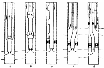 Рисунок 19. Газлифты: а — полуторарядный; б — однорядный с рабочими муфтами; в — однорядный с газлифтными клапанами; г — трехрядный; д - двухрядный. В практике встречается двухрядный подъемник кольцевой системы со ступенчатой нагнетательной колонной: в нижней части - меньшего диаметра, в верхней – большего. По сравнению с обычным двухрядным такой подъемник дешевле. Основные его преимущества - уменьшение веса труб первого ряда и лучшие условия выноса песка с забоя. К недостаткам этого подъемника относится невозможность увеличения погружения подъемных труб. Однако двухрядный подъемник - сооружение металлоемкое, а поэтому дорогое. Лишь при отсутствии герметичности обсадной колонны его применение оправдано как вынужденная мера. Разновидностью двухрядного подъемника является полуторарядный (рис. 19, а) в котором для экономии металла трубы первого ряда имеют хвостовую часть (ниже башмака второго ряда) из труб меньшего диаметра. Это существенно уменьшает металлоемкость конструкции, позволяет увеличить скорость восходящего потока, но осложняет операцию по увеличению погружения, т. е. по допуску второго ряда, так как для этого необходимо предварительно изменить подвеску первого ряда труб. Схема однорядного наименее металлоемкого подъемника приведена на рис. 19, б, в. Газ подается в межтрубное пространство и ГЖС поднимается по одному ряду труб, диаметр которых определяется дебитом скважины и техническими условиями ее эксплуатации. Реальный уровень жидкости всегда устанавливается у башмака подъемных труб. Уровень не может быть выше, так как в этом случае газ не будет поступать в НКТ. Он не может быть и ниже башмака, так как тогда в НКТ не будет поступать жидкость. Однако при пульсирующем режиме работы газожидкостного подъемника уровень жидкости колеблется у башмака, периодически его перекрывая. Видимого погружения и динамического уровня жидкости при однорядном подъемнике нет, а гидростатическое давление у башмака подъемных труб, создаваемое погружением его под динамический уровень, заменяется давлением газа Р1 . Недостатком однорядного подъемника является низкая скорость восходящего потока между забоем и башмаком, глубина спуска которого определяется рабочим давлением газа, отбором жидкости, а также коэффициентом продуктивности скважины. Однако при этом упрощается допуск труб или вообще изменение глубины их подвески, если возникает такая необходимость. Поэтому существует разновидность однорядного подъемника - подъемник с рабочим отверстием. Один ряд труб необходимого диаметра спускается до забоя (или до верхних дыр перфорации), но на расчетной глубине, т. е. на глубине, где должен быть башмак (глубина места ввода газа в НКТ), устанавливается рабочая муфта с двумя-четырьмя отверстиями диаметром 5 - 8 мм. Сечение отверстий должно обеспечить пропуск расчетного количества газа при перепаде давлений у отверстий, не превышающем 0,1—0,15 МПа. Перепад давления у отверстий удерживает уровень жидкости ниже отверстия на 10—15 м и обеспечивает более равномерное поступление газа в трубы. Однорядный подъемник с рабочим отверстием (или муфтой) (рис. 19, б) создает наибольшие скорости восходящего потока, является наименее металлоемким, однако требует подъема колонны труб при необходимости изменения погружения. Положение условного динам