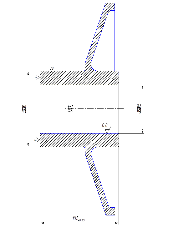 Вид обработки – черновая. Материал и геометрия режущей части инструмента – резец расточной из Т15К6 с φ=60о ; γ=-3о ; λ=+5о ; Режимы резания: глубина t=1.2мм, подача S=0,45мм/об. Скорость резания определяем по формуле: