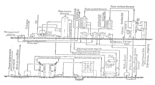 Рисунок 1.1 – Технологическая схема получения сырого бензола Стекающее с первого по ходу газа скруббера насыщенное бензолом холодное масло поступает в сборник, откуда насосом прокачивается с целью использования отходящего тепла последовательно через такие аппараты: 1) паромасляный теплообменник, являющийся верхней частью конденсатора – холодильника, где масло подогревается до 40 – 50° за счет тепла конденсации водяных паров и паров сырого бензола; 2) паромасляный теплообменник, представляющий собой две нижних секции дефлегматора, в котором мало подогревается до 65 – 85° за счет тепла выходящих из бензольной колонны паров; 3) масляные теплообменники, в которых масло подогревается до 80 – 100° за счет тепла стекающего из колонны обезбензоленного масла. После теплообменников насыщенное масло проходит трубчатые подогреватели, в которых глухим паром нагревается до 135 – 140°, затем через расширитель поступает в верхнюю часть бензольной колонны. В расширителе от горячего масла отделяются образовавшиеся уже пары бензола, которые направляются под верхнюю тарелку колонны; масло поступает в колонну несколькими тарелками ниже. В нижнюю часть колонны вводится острый пар, прошедший предварительно паровой регенератор. Часть масла (около 1%мот часового количества) выводится с четвертой (считая сверху) тарелки колонны в регенератор, где в результате продувки острым паром при температуре 170 – 190° масло отделяется от полимеров; пары воды, бензола и масла из регенератора направляются под нижнюю тарелку бензольной колонны, а полимеры периодически или непрерывно выводится из него. Обычно весь острый пар, поступает в бензольную колонну через регенератор, но коммуникация позволяет произвести частичную подачу пара в колонну, минуя регенератор. Выделившиеся в колонне пары сырого бензола и сопровождающие их пары легкокипящих погонов поглотительного масла, а также водяной пар поступают в дефлегматор, в котором охлаждаются до 93 – 94°. Ниже секции дефлегматора охлаждаются насыщенным бензолом маслом, количество которого постоянно; верхняя секция охлаждается водой, количеством которой регулируют температуру паров, уходящих из дефлегматора. В последнем конденсируются пары масла и часть водяных паров. Образовавшийся в дефлегматоре конденсат (флегма), пройдя сепаратор, поступает в сборник, откуда наосом может быть передан в насыщенное бензолом масло. Выходящая из дефлегматора смесь водяных паров и паров сырого бензола поступает в конденсатор – холодильник, где охлаждается до 25 – 30°, и в сепаратор, в котором сырой бензол отделяется от воды. Из сепаратора сырой бензол поступает в мерник для замера продукции и затем насосом выкачивается в хранилище. Горячие обезбензоленное масло с температурой 125 – 135°из колонны стекает в сборник, откуда насосом прокачивается через теплообменники, в которых нагревает насыщенное масло, охлаждаясь при этом до температуры 90 – 80°. После теплообменников обезбензоленное масло поступает в холодильник непосредственного действия, в котором охлаждается до 25 – 30°. Масло может охлаждаться также технической водой в трубчатых воздушно – водяных оросительных холодильниках. Если для улавливания бензола применяется соляровое масло, то в систему должен быть включен деэмульсатор и отстойники. В случаях применения холодильн