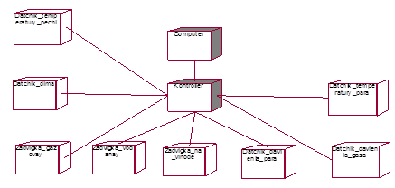 Рис. 4.1.1 Диаграмма топологии Центральным устройством системы управления, функционально связанным со всеми устройствами системы и управляющий ими, является контроллер, что соответствует определенным выше требованиям к системе. Далее определяем, каким образом устройства, показанные на диаграмме топологии, взаимодействуют между собой. Для этого сначала разделим устройства в зависимости от выполняемых ими функций на следующие категории (классы): × Контроллер (класс Controller ) – посылает запросы датчикам и управляющих сигналов исполняющим устройствам. × Задвижки (класс Zadvigka ) - открытие и закрытие. × Датчик давления (класс Datchik _ davlenia ) – измерение давления. × Датчик температуры (класс Datchik _ temperatury ) - измерение температуры. × Датчик дыма (класс Datchik _ dima ) - измерение задымленности. После декомпозиции системы (разбиения на классы), представим ее как совокупность взаимодействующих объектов соответствующих классов. На данной диаграмме приняты следующие обозначения: Datchik_temperatury_pechi – датчик температуры печи; Datchik_temperatury_para – датчик температуры пара; Datchik_dima - датчик дыма; Datchik_davlenia_para – датчик давления пара; Datchik_davlenia_gasa – датчик давления газа; Zadvigka_na_vihode – задвижка на выходе; Zadvigka_vodanay – задвижка на воду; Zadvigka_gazovay – задвижка на газ; Легко заметить, почти все объекты, представленные на диаграмме, соответствуют устройствам на диаграмме топологии. На диаграмме видно, что всем объектам класса Zadvigka контроллером посылаются управляющие сигналы на занятие определенного положения (Pologenie ) соответствующей задвижкой. Датчикам Datchik _ davlenia , Datchik _ temperatury , Datchik _ dima контроллер посылает запросы на выдачу соответственно значения температуры, давления и наличия дыма (Schitat _ informaciu ) . После того, как были определена принадлежность объектов тем или иным классам, детализируем каждый класс с целью определения свойств объектов системы. Класс Zadvigka Так как клапаны должны выполнять только функции открытия и закрытия, класс не содержит атрибутов, а содержит только два метода: Pologenie () и Zakrit () . Класс Datchik_temperatury Класс Datchik_davlenia Класс Datchik _ dima Класс Controller Должен содержать в себе все введенные оператором параметры технологического процесса: Schitat _ informaciu – считывание информации с датчиков. Stop – остановка работы системы. Izmenit _ parametr – изменение параметров работы системы . Класс Computer Prinat _ informaciu – принимает информацию с датчиков и контроллера. Stop – сигнал на остановку системы. Izmenit _ parametr – сигнал на изменение параметров. Все выше сказанное представлено на диаграмме классов рис. 4.1.3