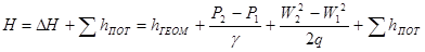 Рассмотрим общий случай: трубопровод, в котором по пути движения жидкость совершает работу или над ней совершается работа. Полный напор жидкости в начальном и конечном сечениях трубопровода соответственно: