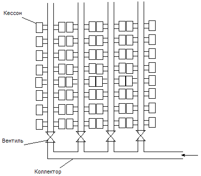 Рис.4. Схема соединения кессонов на стояке. На первом участке параллельно соединены два кессона, поэтому расход вычисляем по формуле:
