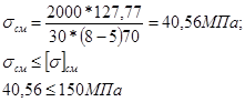 Где Т-передаваемый шпонкой крутящий момент; d – диаметр вала (мм); lp – рабочая длина шпонки (мм); [σ]см =100…200 МПа.
