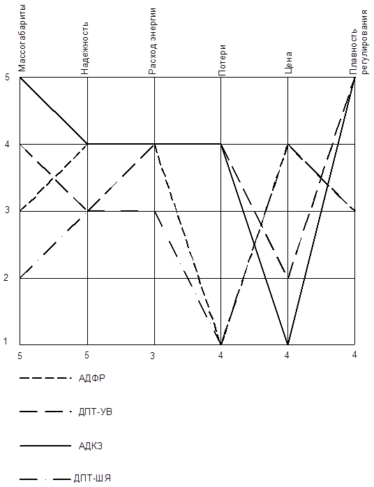 Рисунок 3.1 - Кинематическая схема электропривода механизма подъема. Составление расчетной схемы механической части электропривода приведено в пункте 4.2 На рис. 3.1 введены следующие обозначения: 1 - двигатель; 2 - соединительная муфта; 3 - редуктор; 4 –барабан; 5 – канат; 6 – полиспаст; 7 – грузозахватывающего устройства; 3.2 Выбор типа привода и способа регулирования координат Для приведения в движение механизма крана можно использовать несколько вариантов двигателей. Это может быть двигатель постоянного тока независимого или последовательного возбуждения, может быть асинхронный двигатель. Можно применять двигатели общепромышленного исполнения. Также промышленностью выпускаются специальные крановые серии двигателей постоянного и переменного тока. Каждый из этих двигателей имеет свои достоинства и недостатки. Так, например, двигатели постоянного тока позволяют легко и хорошо регулировать скорость вращения, но по габаритам они намного превосходят двигатели переменного тока. Асинхронные двигатели по габаритам меньше, но система регулирования двигателей переменного тока сложнее. Возможными способами регулирования скорости вращения двигателей постоянного тока являются регулирование напряжения питания с помощью управляемых выпрямителей для двигателей с независимым возбуждением и шунтированием якоря для двигателей с независимым и последовательным возбуждением. Для управления асинхронным двигателем с короткозамкнутым ротором можно использовать преобразователь частоты. Все эти способы так же отличаются друг от друга сложностью, потерями, стоимостью и требуют выбора оптимального способа регулирования для каждого конкретного случая. Ниже приведены возможные решения с учетом предъявляемых к приводу требований. двигатель постоянного тока с независимым возбуждением, регулирование напряжения с помощью управляемого выпрямителя; двигатель постоянного тока с последовательным возбуждением, шунтирование якоря; двигатели общепромышленного исполнения с короткозамкнутым ротором, частотное управление; двигатели общепромышленного исполнения с фазным ротором, сопротивления в цепь ротора; 3.3 Оценка и сравнение выбранных вариантов Оценка и сравнение данных вариантов осуществляется с помощью метода экспертных оценок. Выбираем несколько критериев сравнения. В нашем случае это: массогабаритные показатели, потери, стоимость, надежность и плавность регулирования. Каждому из этих критериев присваиваем определенный максимальный бал и затем производим оценку вариантов по этим критериям, выставляя им соответствующие балы. После этой процедуры производится подсчет баллов, набранных каждым из вариантов, и выбирается тот вариант, который имеет наибольший суммарный балл. Диаграмма сравнения приведена на рисунке 3.2. В результате получили следующее распределение баллов: S1=4*5+3*5+4*3+4*4+2*4+5*4 = 91; S2=2*5+3*5+3*3+1*4+4*4+3*4 = 66; S3=5*5+4*5+4*3+4*4+1*4+5*4 = 97; S4=5*5+4*5+4*3+4*4+1*4+4*4 = 74; Из данных соотношений видно, что максимальный суммарный балл имеет двигатели общепромышленного исполнения с короткозамкнутым ротором и частотным управлением.
