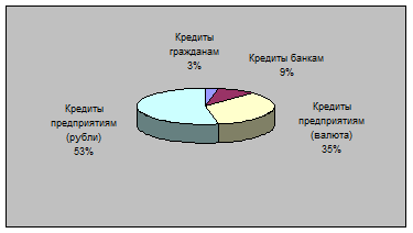 Санкт-Петербургский рынок банковских кредитов традиционно является одним из важнейших секторов регионального финансового рынка. Несмотря на продолжающийся спад промышленного производства, банковские кредиты являются основными источниками внешнего финансирования и обеспечения устойчивости текущей деятельности (как источника пополнения оборотных средств) предприятия. Значительно в меньшей степени получаемые предприятиями банковские кредиты направляются на реализацию инвестиционных проектов, что в условиях недостаточности наличия собственных средств предприятий существенно сказывается на реализации инвестиционных программ и технического перевооружения в большинстве отраслей региональной экономики. Объемы и структура кредитных вложений коммерческих банков Санкт-Петербурга приведены в таблице №4. Таблица №4 Кредитные вложения коммерческих банков Санкт-Петербурга и филиалов иногородних банков в 1996 году