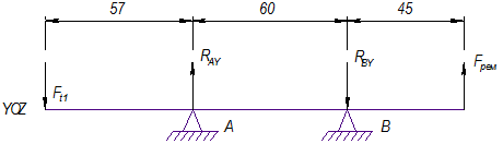 Рисунок 3 – Силы в плоскости YОZ. Вычисляем реакции при