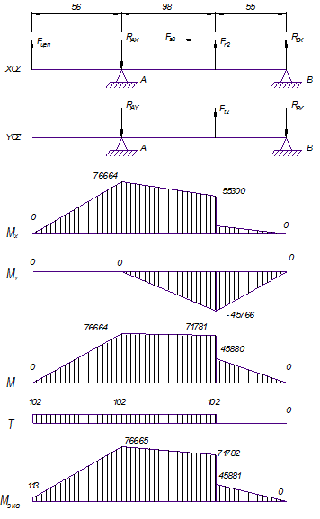 Предоставляем эпюру крутящих моментов, передаваемых валом, Вычисляем эквивалентные изгибающие моменты в характерных точках вала, с предоставлением их эпюр,