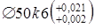 (Пробка 8133-0962 H7 ГОСТ 14810-69). Предельные размеры для вала dmax = в + es = 50 + 0,021 = 50,021 мм; dmin = в + ei = 50 + 0,002 = 50,002 мм. По [2, с. 266—269, табл. 1] для IT6 и интервала размеров 30-50 мм находим данные для расчета калибров a1 = 0 мм; Z1 = 0,004 мм; Y1 = 0,003 мм; H1 = 0,005; Hp = 0,002 мм. Формулы для расчета размеров калибров по [2, с. 270, табл. 2]. Предельные размеры проходного нового калибра-скобы: ПРmax = dmax – Z1 + H1 / 2 = 50,021 – 0,004 + 0,005 / 2 = 50,0195 мм; ПРmin = dmax – Z1 – H1 / 2 = 50,021 – 0,004 – 0,005 / 2 = 50,0145 мм. Исполнительный размер калибра-скобы ПР 50,0145+0,005 . Наибольший размер изношенного проходного калибра-скобы: ПРизн = dmax + Y1 = 50,021 + 0,003 = 50,024 мм. Когда калибр ПР будет иметь этот размер, его нужно изъять из эксплуатации. Предельные размеры непроходного нового калибра-скобы: НЕmax = dmin + H1 / 2 = 50,002 + 0,005/ 2 = 50,0045 мм; НЕmin = dmin – H1 / 2 = 50,002 – 0,005 / 2 = 49.9995 мм. Исполнительный размер калибра-скобы НЕ 49.9995+0,005 (Скоба 8113-0140 k6 ГОСТ 18360-93). Предельные размеры проходного контркалибра: К–ПРmax = dmax – Z1 + Hp / 2 = 50,021 – 0,004 + 0,002 / 2 = 50,018мм К–ПРmin = dmax – Z1 – Hp / 2 = 50,021 – 0,004 – 0,002 / 2 = 50,016 мм. Исполнительный размер контркалибра К–ПР 50,018–0,002 . Предельные размеры контркалибра контроля износа: К–Иmax = dmax + Y1 + Hp / 2 = 50,021 + 0,003 + 0,002 / 2 = 50,025 мм; К–Иmin = dmax + Y1 – Hp / 2 = 50,021 + 0,003 – 0,002 / 2 = 50,023 мм. Исполнительный размер контркалибра К–И 50,025–0,002 . Предельные размеры непроходного контркалибра: К–НЕmax = dmin + Hp / 2 = 50,002 + 0,002 / 2 = 50,003 мм; К–НЕmin = dmin – Hp / 2 = 50,002 – 0,002 / 2 = 50,001 мм. Исполнительный размер контркалибра К–НЕ 50,003–0,002 . Таблица 7.2 — Расчет размеров калибров