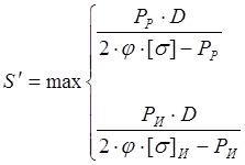 = где rрас - плотность рассола при температуре минус 28,5 °С, кг/м3 ; g - ускорение свободного падения, м/с2 ; Н - высота столба жидкости, м. Плотность рассола при температуре минус 25,5 °С: rрас = 1270 кг/м3 Ускорение свободного падения: g = 9,81 м/с2 Высота столба жидкости определили как длину труб: Н = 6 м Гидростатическое давление в конденсаторе: Рг = 1270 × 9,81 × 6 = 74752,2 Па Расчетное давление: Ррасч = Рраб + Рг , Ррасч = 300000 + 74752 = 374752 Па Нормальное допускаемое напряжение [s], МПа для стали 16ГС при температуре минус 28,5°С рассчитывали согласно [17,С.9] как для температуры плюс 20°С в рабочих условиях: [s] = h × s (4.2) где [s] - допускаемое напряжение, МПа; h - поправочный коэффициент, учитывающий вид заготовки; s - нормативное допускаемое напряжение при расчетной температуре, МПа. Поправочный коэффициент h, учитывающий вид заготовки приняли согласно [17,С.10] как для листового проката: h = 1,0 Нормативное допускаемое напряжение при температуре плюс 20 °С принимали согласно [17,С.11]: s = 170 МПа Допускаемое напряжение составит: [s] = 1,0 × 170 = 170 МПа Допускаемое напряжение при гидроиспытании: [s] = sт / 1,1 (4.3) где [s] - допускаемое напряжение при гидроиспытании, МПа; sт - предел текучести, МПа. Предел текучести принимали согласно [17,С.282]: sт = 280 МПа Допускаемое напряжение при гидроиспытании составило: [s] = 280 / 1,1 = 254,55 МПа Расчетную толщину стенки аппарата S', определили согласно [17,С.18]: