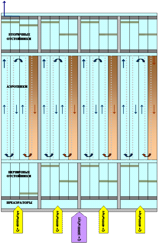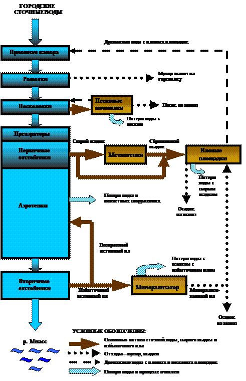 В настоящее время производительность станции в основном составляет около 500000 м3 /сут. Очистка производится по двухступенчатой схеме - механическая и биологическая очистка. Механическая очистка – освобождение сточной воды от мусора, минеральных нерастворимых веществ, крупных частиц органики. Биологическая очистка – очистка сточных вод от растворимой и мелкодисперсной органики под воздействием аэробных микроорганизмов. При этом соединения азота аммонийного (мочевина) переходят в соединения нитратов, для природы менее опасные – процесс нитрификации. Процесс денитрификации – разрушение нитратов с выдувание атомарного азота в воздух. После биологической очистки вода сбрасывается в реку Миасс. Основные процессы технологии очистки стоков и обработки осадков отражены на рисунке 3. Очищенные стоки не обеззараживаются. Осадки, образующиеся в процессе очистки стоков, размещаются на иловых площадках, расположенных на территории станции. В состав очистных сооружений входят: - приемная камера; - здание решеток; - песколовки; - камеры "Вентури" № 1 и № 2; - блоки емкостей - 4 штуки; - вспомогательные цеха и сооружения. Существующие объекты станции очистки стоков сведены в таблицу 2. Таблица также содержит характерные размеры основных технологических объектов.