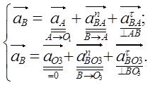 Группа Ассура II 1 (2,3). Внешними точками группы являются точки А и О3 , внутренней – точка В . Составляется система векторных уравнений, связывающих ускорение внутренней точки с ускорениями внешних точек: