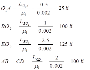 1.1 Геометричний синтез механізму (визначення розмірів ланок по основних і додаткових умовах синтезу) При геометричному синтезі схеми механізму виробляється визначення розмірів його ланок при заданому русі вихідної ланки, що є основною умовою синтезу. Експлуатаційні якості механізму визначаються додатковими умовами синтезу. До них ставляться, наприклад, коефіцієнт зміни середньої швидкості, від якого залежить продуктивність, обмеження кутів тиску, що визначає умови передачі сил і пов'язане із КПД і відсутністю самогальмування й т.д. Вхідними параметрами для синтезу підоймового-шарнірно-важільного механізму є довжина кривошипа: LO1A =0.5 м. Довжина ланки CO3 дорівнює:LCO3 = 4LO1A ; LCO3 =4*0.5=2 м. Довжина ланки EO3 дорівнює:LEO3 =5LO1A ; LEO3 =5*0.5=2.5 м. Довжина ланки BO3 дорівнює:LBO3 =2LO1A ; LBO3 =2*0.5=1 м. 1.2 Розрахунок плану положень механізму Для побудови схеми механізму виберемо масштабний коефіцієнт: