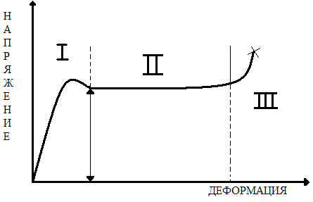Чем меньше Мс (больше густота сшивания), тем сильнее растет Тс . Приведенная формула больше применима к каучукам, а для пластмасс числовые коэффициенты другие. Влияние пластификации. Пластификаторы понижают Тс и тем самым расширяют интервал, в котором полимер сохраняет гибкость и деформируемость. Пластификаторы — это жидкости, обладающие малой летучестью, высокой температурой кипения и низкой температурой замерзания. В них свободный объем больше, чем свободный объем полимера, поэтому введение пластификатора увеличивает свободный объем в системе и приводит к снижению Тс . Увеличение свободного объема приводит также к снижению межмолекулярного взаимодействия. Снижение межмолекулярного взаимодействия особенно выражено, если в полимере есть сильные межмолекулярные связи, например водородные. Если пластификатор подобран правильно, он экранирует полярные группы, препятствуя образованию связей полимер—полимер. Это также снижает Тс . Чем больше добавлено пластификатора, тем сильнее снижается Тс . Неполярный пластификатор понижает Тс неполярного полимера (∆Тс ) пропорционально объемной доле пластификатора (φ) в полимере (эффект разбавления): ∆Тс =k' φ Полярный пластификатор понижает Тс полярного полимера пропорционально мольной доле пластификатора (N) в полимере (экранирование полярных групп): ∆Тс = k''N МЕХАНИЧЕСКИЕ СВОЙСТВА ПОЛИМЕРНЫХ СТЕКОЛ Поскольку в стеклообразном состоянии сегменты лишены возможности совершать тепловые перемещения в соседние положены из-за отсутствия достаточного свободного объема, можно сделать вывод, что стеклообразный полимер не способен к большим деформациям. В действительности же стеклообразный полимер способен деформироваться без разрушения на сотни процентов, хотя и не способен самопроизвольно сокращаться после снятия нагрузки. На рис. 3 приведена кривая напряжение—деформация стеклообразного полимера. Весь процесс растяжения условно делится на три стадии. На первой стадии полимер растягивается упруго. Деформация достигается за счет увеличения межмолекулярных расстояний или малого смешения (без разрушения) узлов флуктуационной сетки. Происходит увеличение свободного объема при неизменной температуре за счет действия механических напряжений.