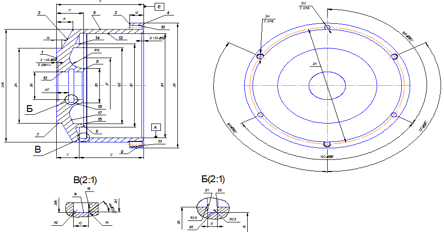 заготовку корпуса, возможно, получить как литьем в земляные формы, так и в виде сварной конструкции, состоящей из фланца, трубы и дна. в обоих случаях заготовка проста по конфигурации и может быть получена без особых затрат. наиболее предпочтительный вариант получения заготовки определим экономическим расчетом. таким образом, заготовку можно считать технологичной. 1.3.2 технологичность установкиЧерновыми базами для установки заготовки на первой операции могут быть цилиндрические и торцевые поверхности заготовки. в дальнейшем за базы приняты цилиндрическая пов.12 и торцевая пов.4 или цилиндрическая пов.13 и торцевая пов.1, в зависимости от операции (операции 10, 20, 30, 40, 90, 100); на операции 50 за базы приняты торцевая пов.1 и цилиндрическая 8; на операции 120, 130 за базы приняты торцевая пов.1 и цилиндрическая 12, 13 соответственно. Данные технологические базы обеспечивают надежную ориентацию и закрепление заготовки, возможность свободного подвода инструмента при обработке. Поверхности детали достаточно развиты, поэтому при обработке не требуется применение сложных и дорогостоящих станочных приспособлений. Измерительные базы детали можно использовать в качестве технологических баз, т.к. точность и шероховатость этих баз обеспечивает требуемую точность обработки. Таким образом, с точки зрения установки при обработке, деталь можно считать технологичной. 1.3.3 Технологичность обрабатываемых поверхностейПредполагается обрабатывать все поверхности детали, кроме пов.2, 3, 7, 8, 9, 14, 15, 16, 17 (т.к заданные точность и шероховатость позволяют их получить на заготовительной операции). число обрабатываемых поверхностей 14: 4 цилиндрических: 12, 13, 10, 11 ; 4 торцевых: 4, 1, 5, 6 ; 3 резьбовых отверстия: пов .11 ; 2 канавки: пов.18, 19, 20, 21, 22 ; фаски. Протяженность обрабатываемых поверхностей невелика и определяется условиями компоновки гидроцилиндра. Для обеспечения нормальной работоспособности всех узлов гидроцилиндра назначены следующие требования к геометрии корпуса: допуск на расположение отверстий под штифты и резьбовые отверстия под болты, чтобы обеспечить точное позиционирование элементов гидроцилиндра относительно корпуса при сборке, допуски на шероховатость назначаем по [1], точность резьбовых соединений по [1], допуски перпендикулярности торцов 4,6; допуск радиального биения назначаем по [2]. Точность и шероховатость поверхностей 12, 13 (окб) определяется условиями эксплуатации корпуса гидроцилиндра. уменьшение точности приведет к снижению точности установки поршня и вала в корпус гидроцилиндра. все отверстия корпуса легко доступны для обработки. поверхности различного назначения разделены, что облегчает обработку. для выхода шлифовального круга, а также хонинговальной головки при обработке пов.12 предусмотрена канавка. на пов.13 предусмотрена канавка под уплотнительное кольцо. форма детали позволяет обрабатывать поверхность напроход. обработка поверхностей в упор затруднений не вызывает. Таким образом, с точки зрения обрабатываемых поверхностей, деталь можно считать технологичной. 1.3.4 Технологичность общей конфигурации деталиДеталь имеет достаточную жесткость и прочность. радиусы закруглений и фаски выполняются по гост 10948-64, форма и размеры канавок по ГОСТ 8820-69. такая унификация упростит обработку и контроль этих элементов корпуса гидроцилиндр