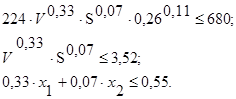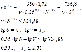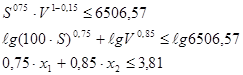 Прологарифмируем выражение: 0,6·lg (100S) - 0,3· lgV ≤ lg 11,76 Пусть lg (100S) =x1 ; lgV =x2 , тогда 0,6· x1 -0,3· x2 ≤ 1,069 2x1 - x2 ≤ 3,56 Ограничение по точности