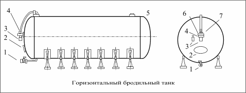 Рис.5-Схема горизонтального цилиндрического танка. Танк представляет собой герметичный цилиндрический сосуд вместимостью от 8 до 50 м3, Снабженный охлаждающим змеевиком. На нем имеется штуцер для присоединения пивных шлангов, кран1 для наполнения и спуска пива, люк 2 для осмотра и мойки внутренней полости, кран 3 для отбора проб, штуцеры 4 и 6, для установки шпунт - аппарата и штуцер 7 для установки манометра, а также предохранительный клапан 5. Для обеспечения достаточного осветления молодого и готового пива танки для главного брожения изготавливают диаметром не более 2,4 м, а танки для дображивания –3,6 м. Вместимость одного танка подбирают с учетом объёма сусла, получаемого от одного, двух и более заторов. Число танков в цехе определяют в зависимости от числа варок затора в сутки и продолжительности процессов главного брожения. Процессы, протекающие при главном брожении. При спиртовом брожении в сусле протекают биологические, биохимические, физико- химические процессы. Питательные вещества , поступающие в дрожжевые клетки из сусла, под действием ферментов превращаются в различные промежуточные продукты, расходуемые на спиртовое брожение и рост дрожжей( биологический процесс) происходит в начальной стадии сбраживания пивного сусла и заканчивается задолго до конца брожения. Основным биохимическим процессом брожения является превращение сбраживаемых сахаров в этиловый спирт и диоксид углерода: С6Н12О6=2 СН3СН2ОН +2СО2 Эта реакция сопровождается выделением тепла. Большая часть экстракта сусла состоит из углеводов, из них около 75% сбраживаются (сбраживаемые сахара) Часть экстракта составляют несбраживаемые вещества. К ним относятся декстрины, белки, минеральные вещества и др. Сахара сбраживаются в определенной последовательности, что обусловлено скоростью их проникновения в дрожжевую клетку. В первую очередь сбраживается фруктоза и глюкоза. Сахароза предварительно гидролизуется ферментом β- фруктофуранозидазой дрожжей до глюкозы и фруктозы, которые также расходуются в первую очередь. После фруктозы и глюкозы дрожжи поглощают мальтозу, которая под действием фермента α- глюкозидазы превращается в легкосбраживаемую глюкозу. Мальтотриоза расходуется дрожжами медленно и не полностью. В сусле, богатом мальтозой, мальтотриоза почти не сбраживается. Около 2% сахаров используются на построение дрожжевых клеток. Этиловый спирт и диоксид углерода являются основными продуктами спиртового брожения. Кроме того, в сусле накапливается глицерин, уксусный альдегид, уксусная, янтарная, лимонная и молочная кислоты. В качестве побочных продуктов брожения из аминокислот образуются высшие спирты, оказывающие влияние на вкус пива. Вредное влияние на качество пива оказывают продукты брожения диацетил и ацетоин, которых много в молодом пиве. Диацетил придает пиву медовые запах ипривкус, а ацетоин- затхлый привкус. При дображивании концентрации этих веществ резко снижаются и их влияние на вкус и запах пива становятся незначительными. В результате сбраживания сахаров, преимущественно в аэробных условиях, пивное сусло превращается в молодое пиво. Все образовавшиеся в нем продукты спиртового брожения участвуют в формировании специфического вкуса и аромата пива. При дображивании, когда температура молодого пива снижается, в бродильном апп