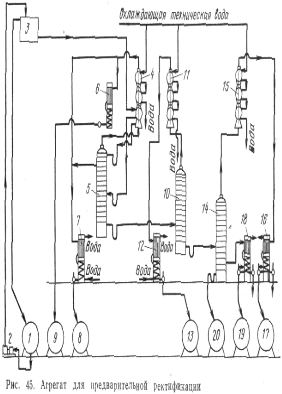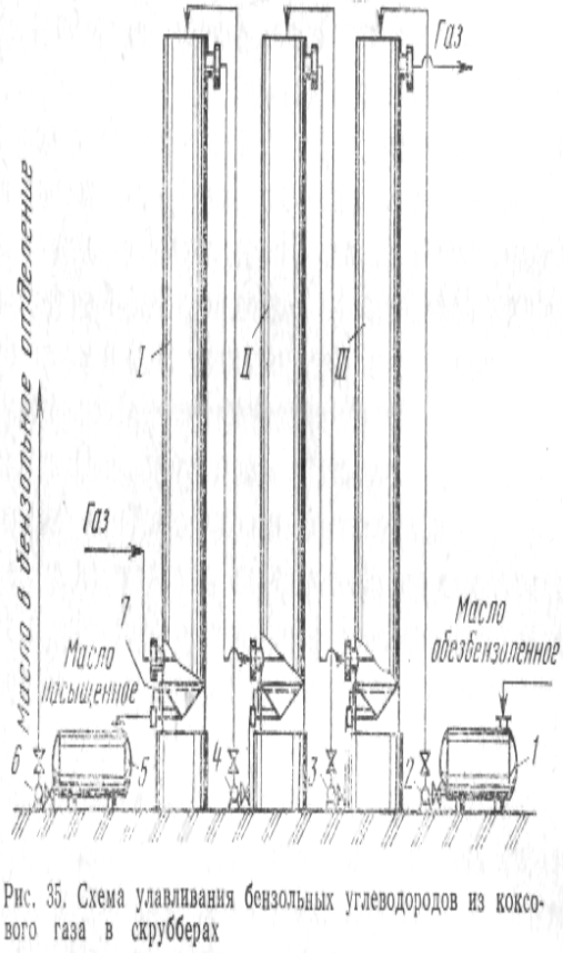 ТЕХНОЛОГІЯ Й УСТАТКУВАННЯ ДЛЯ ПЕРЕРОБКИ СИРОГО БЕНЗОЛУ Технологічні схеми і режим переробки сирого бензолу Сирий бензол являє собою багатокомпонентну систему, основними складовими яке є одноядерні ароматичні з'єднання — бензольні вуглеводні і різні домішки. Основна маса сирого бензолу википає до 18 (ВУС, Вище цієї температури киплять легкокипящие погони поглинальної олії, що містяться в сирому, бензолі, а також неграничні з'єднання. Наявність у сирому бензолі неграничних і сірчистих з'єднань виключає можливість безпосереднього одержання з нього чистих продуктів без попереднього очищення його від цих небажаних домішок. Порозумівається це тим, що навіть незначні домішки сірки в бензолі і толуолі, застосовуваних для деяких органічних синтезів, викликають швидке отруєння каталізатора, а смолисті речовини, що утворяться в результаті полімеризації неграничних з'єднань, обволікають поверхня каталізатора, дезактивируют неї. У зв'язку з цим переробка сирого бензолу повинна здійснюватися таким чином, щоб бензольні продукти, що виходять, не містили неграничних і сірчистих чи з'єднань же містили в дуже незначних кількостях, що виключають їхній шкідливий вплив у процесі виробництва синтетичних продуктів. У промисловості для переробки сирого бензолу використовуються два процеси 1) ректифікація-поділ суміші внаслідок по-різному температур кипіння її компонентів; 2) очищення — виділення неграничних і сірчистих з'єднань. Тому в будь-яку технологічну схему переробки сирого бензолу обов'язково включається попередня стадія, призначення якої видалити домішки неграничних і сірчистих з'єднань, а потім переходити до ректифікації очищеної сировини й одержанню товарних продуктів. На коксохімічних заводах СРСР найбільше поширення одержала технологічна схема переробки сирого бензолу з одержанням чистих продуктів, що включає наступні технологічні операції: 1) одержання фракції ВТК (бепзолыю-толуольно-ксшюльной) шляхом виділення сірковуглецевої фракції з першого чи бензолу попередньої ректифікації сирого бензолу (з відгоном до 180°С); 2) сернокислотную очищення фракції ВТК; 3) ректифікацію очищеної фракції БТК. На першій стадії відбувається виділення сірковуглецю і деякої частини неграничних з'єднань і насичених вуглеводнів, на другий — очищення від неграничних з'єднань і тиофена і на третьої — виділення бензолу й інших продуктів з очищеної фракції БТК. У деякі технологічні схеми включають ректифікацію сірковуглецевої фракції, редистилляцию другого бензолу й одержання бензолу для синтезу. Основи переробки сирого бензолу Основна мета переробки сирого бензолу - виділення найважливіших ароматичних компонентів (бензолу, толуолу, ізомерів ксилолу й ін.) у можливо більш чистому виді з найменшими втратами й одержання поряд з цим корисних для народного господарства продуктів і ароматичних домішок. Виділення чистих продуктів із сирого бензолу здійснюється методом ректифікації, що є одним з найбільш ефективних для поділу рідких сумішей на окремі компоненти. Для переробки сирого бензолу і його фракцій набули застосування безупинна і періодична ректифікація під атмосферним тиском, і ректифікація у вакуумі для редистилляции другий бензол а. Процес ректифікації сирого бензолу здійснюється в колонах барботажпого типу, що мають усеред