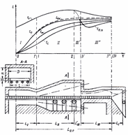 Рисунок 6 – Изменение температуры газов и металла по длине методической печи 1.2 Конструкция пода и транспортирующих устройств Возможны следующие основные конструктивные варианты: 1) сплошной (неканализированный) под с неохлаждаемыми опорами и другими устройствами для транспорта заготовок; 2) канализированный под с неохлаждаемыми или охлаждаемыми транспортирующими устройствами. Конструкции без охлаждения влияют по существу только на величину эффективной поверхности нагреваемого материала. Конструкции, включающие охлаждаемые элементы, отнимают тепло от рабочего пространства и нагреваемого материала. 1.3 Режим нагрева материала и способ выдачи его из печи Укрупнено этот режим может быть определен как трехзонный и двухзонный. При работе печи по трехзонному режиму (рисунок 7) в первой по ходу металла зоне (зоне I или методической) происходит нагрев металла за счет физического тепла продуктов сгорания, которое завершается на границе зон I и II , обозначенной на рисунке 5 цифрой 1 . Так как отдача физического тепла вызывает охлаждение газов, то их температура по длине зоны I заметно снижается.