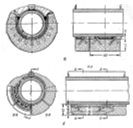 Рисунок 8 – Глиссажные трубы трехзонной нагревательной печи В пределах высокотемпературной зоны продольные глиссажные трубы опираются на поперечные водоохлаждаемые трубы, расположенные на расстоянии 1 – 1,5 м одна от другой. Концы поперечных труб выведены за пределы печи и прикреплены к вертикальным стойкам каркаса печи. В середине поперечные глиссажные трубы опираются на вертикальную опору, выполненную из пары водоохлаждаемых труб, футерованных снаружи огнеупорным кирпичом. Водоохлаждаемые глиссажные трубы оказывают большое влияние на тепловую работу зоны нижнего обогрева и тепловую работу печи в целом. Расход тепла с охлаждающей водой в методических печах составляет 10%, а иногда и более от всего количества поступающего в печь тепла. Кроме того, глиссажные трубы оказывают значительное охлаждающее действие на металл и препятствует его равномерному нагреву. В связи с этим стремятся выполнить снаружи тепловую изоляцию глиссажных труб, чтобы снизить поступление тепла к стенке трубы и ослабить ее охлаждающее действие. В качестве тепловой изоляции глиссажных труб применяют всевозможные огнеупорные обмазки. Чтобы тепловая изоляция не отлетела, пользуются различными приемами: приваривают металлические прямые и изогнутые штыри, выполняют из огнеупорных масс специальные огнеупорные блоки, которые нанизываются на трубу. Выделяют три перспективные конструкции глиссажных труб: 1) с набивкой огнеупорной массы между шипами, приваренными непосредственно к трубам; 2) с набивными блоками (рисунок 9, а ); 3) со сборными блоками из керамических сегментов (рисунок 9, б ). Потери тепла с охлаждающей водой при использовании набивной на шипы изоляции по сравнению с потерями при неизолированной трубе снижаются в 2 – 3 раза, а при навесной изоляции из сегментов или блоков потери удается снизить в 4,6 – 6,3 раза. Значительная разница в эффективности изоляции объясняется тем, что набивная на шипы изоляция из-за большей массы металла в ней характеризуется значительно более высокой, чем блочная изоляция, средней теплопроводностью. Промышленная проверка срока службы блочной изоляции показала, что для большинства печей, отапливаемых газом, где температура под металлом не превышает 1375о вполне применимы для изоляции подовых труб набивные и сборные шамотные блоки, срок службы которых в указанных условиях составляет от 9 месяцев (в области повышенных температур) до 2 лет (в области пониженных температур). В печах, отапливаемых мазутом, где температура под металлом достигает 1500о , хорошие результаты показали набивные блоки, изготовленные из магнезитовой (магнезитохромитовой) массы, срок службы которых составляет более 9 месяцев.