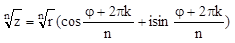 Рассмотрим уравнение: Его решением будет корень n–ой степени из комплексного числа z: Корень n–ой степени из комплексного числа z имеет ровно n решений (значений). Корень из действующего числа n-ой степени имеет только одно решение. В комплексных – n решений. Если комплексное число задано в тригонометрической форме: z=r(cos