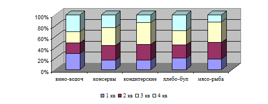 Рис.1.6. Динамика товарной структуры поступления продукции, % Структура поступления, как и объем, изменяется с каждым кварталом. Проводя анализ, необходимо установить, от каких поставщиков и в каком объеме закупались товары в отчетном и прошлых годах, какие имеются возможности расширения их закупки в будущем, особенно на льготных условиях (в порядке консигнации, оплаты товаров спустя определенное время после их реализации и т.п.). Для анализа и оценки поступления товаров в стоимостном и натуральном выражении составляют специальные аналитические таблицы, по данным которых можно глубоко изучить товароснабжение. Используя данные о поступлении отдельных товаров и товарных групп в стоимостном и натуральном выражении, можно рассчитать потоварные средние розничные цены и измерить влияние ценового фактора на размер товарных ресурсов. Средние цены определяют делением розничной стоимости поступивших товаров на их количество. Далее отклонение от плана или в динамике по средней розничной цене товара (товарной группы) умножают на фактическое количество поступившего товара за отчетный период и в результате определяют влияние ценового фактора на розничную стоимость поступившего товара. Большое значение имеет проверка соблюдения договоров поставки товаров отдельными поставщиками. В процессе анализа изучают степень выполнения договоров поставки по общему объему, ассортименту и качеству товаров, срокам поступления, условиям транспортировки, упаковки, выявляют случаи нарушения договорных обязательств, если они имели место, и устанавливают их причины, а главное принимают меры по соблюдению договорных обязательств в будущем, улучшению товароснабжения. Нарушения выполнения договоров поставки товаров могут быть по вине поставщиков (несвоевременное заключение договоров и согласование спецификаций, нарушение договорных обязательств по объему, ассортименту и качеству поставляемых товаров, срокам отгрузки и другим условиям их поставки) или по вине розничных торговых предприятий (несвоевременное заключение договоров и представление поставщикам разнарядок и заявок на поставку товаров, отказ от заказанных товаров, нарушение действующего порядка расчетов и т.д.). В первом случае необходимо проверить, приняло ли торговое предприятие все необходимые меры воздействия на поставщиков, предусмотренные законом и договорами, по устранению и предупреждению недостатков в поставке товаров. Во втором случае следует установить причины и конкретных виновников, приведших к ухудшению товароснабжения. Причины нарушений договоров поставки товаров изучают по данным оперативного учета их выполнения, претензионным делам и другим источникам информации. Важным вопросом является изучение частоты и своевременности завоза товаров. Несвоевременная поставка товаров по месяцам, декадам и отдельным дням, а по некоторым из них и по часам отрицательно сказывается на выполнении плана и динамики товарооборота, торговой деятельности магазинов. В то же время равномерный и частный завоз товаров обеспечивает сохранение их качества и нормализует товарные запасы. На практике еще нередки случаи, когда преобладающая часть товаров поступает в магазины в конце отчетного периода (года, квартала, месяца) при недопоставке их в начале. Для оценки равномерност